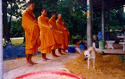 僧侶は自分のために供物を受け取るわけではなく、村人のために受け取る。従って、僧侶が袈裟の中に供物を納めると、村人が感謝の気持ちを表す。(写真) 寺に戻ると、僧侶の朝食が始まる。